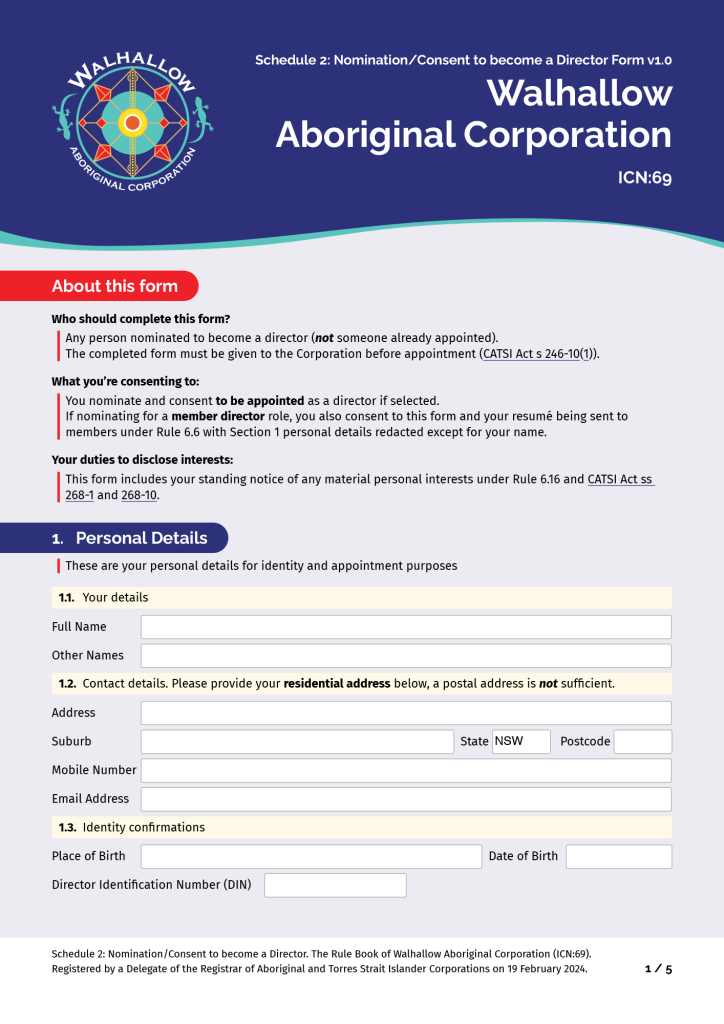 Use this form if you are being nominated to become a director of Walhallow Aboriginal Corporation. By completing it you consent to appointment if selected, provide your personal and contact details, disclose any material personal interests and outline your relevant experience. You also confirm the eligibility requirements in the Rule Book, which include providing a Director Identification Number, completing a Working with Children Check and obtaining a National Police Certificate.