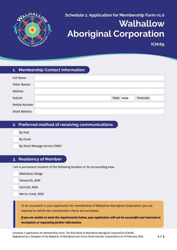 Walhallow Aboriginal Corporation is community-controlled and guided by culture. This page brings together the two forms you need to take part in our governance.
